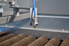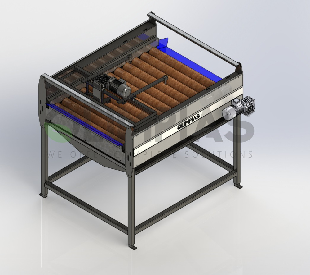 The waxing unit consists of rotating cylindrical brushes for product waxing. The brushes are outfitted with natural horse hair. Their number and size depends on the product type and the customer’s specifications. A special spraying system with nozzles is situated above the brushes. This spraying system is adjusted through an electronic dosing pump in order to achieve a precise flow rate and maximize economy. The rotation speed of the brushes is adjusted by a suitable inverter. A drainage tank is located under the brushes, in order to collect excess water and fruit residue.